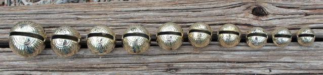 (shown below), a delightful small bell (1 3/8"), with a "goat-proof" ringer. Our second most quiet bell (Acorn bells are the most quiet). A delightful, ornate jingle bell for smaller stock such as a "starter bell" for little kid goats. Solid brass.
