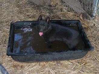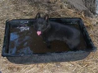 One of our Schips enjoying a Home Depot or Lowe's $6 mortar mixing tray with water on a hot day.